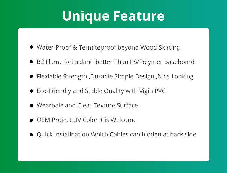 Esta serie está oculta por clavos y es resistente al agua. Mientras que el rodapié de PVC es una alternativa rentable a la madera.Es económico y, sin embargo, increíblemente resistente.Es adecuado para áreas de alto tráfico en una casa, incluidas las habitaciones utilizadas por los niños.No se raya fácilmente y cualquier marca se puede limpiar fácilmente.A diferencia de la madera, no se pela, pudre ni deforma.Tampoco necesitará renovar la pintura cada dos años.También es higiénico.